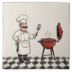 "jolly chef grilling hamburgers", "cook red BBQ barbecue", "chefs hat barbeque bugers", "black and white diamond floor", "meat burger grill kitchen fun", "cooking themed ceramic tile", "beige cream light neutral", "happy smiling face smile", "moustache moustache italian man", "french gourmet professional staff"