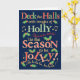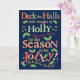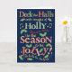 A decorative Christmas card with the text, 'Deck the Halls with boughs of Holly, 'tis the Season to be Jolly!' in colourful lettering, outlined in gold-effect on a deep blue background. A digitally created, text-based design by Judy Adamson.