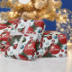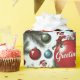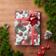 Interspersed throughout the pattern are green pine boughs, adding a touch of natural holiday greenery. Smaller ornaments in various shades of red, green, and blue, as well as some white or silver, are scattered across the paper, further enhancing the festive feel. The overall impression is cheerful and traditional, making it ideal for holiday gift-giving.