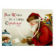 Nostalgic image of Victorian era red-robed Santa Claus carrying bag of toys receiving a letter from a shy child in blue coat and hat.