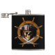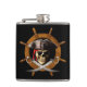 Aargh! Pirate skull, eye patch, pirate hat, and crossed swords over an antique wooden ship's wheel.