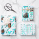 Creating personalized Christmas photo wrapping paper is a cute way to delight family and friends and this JOLLY script design assortment in a mix of turquoise and teal blue hues, from classic turquoise to dark teal to bright aqua blue on white is a fun and easy way to design your own. Fill in the templates provided by adding your favourite photos then add your child's name (or your last name or JOLLY JOLLY if you prefer) to the turquoise typography on white design on Sheet Three and this custom Christmas wrapping paper is ready to be printed, just for you. Sheet One features two of your photos transformed into an oval format bordered in dark and bright turquoise, serving as the O in JOLLY, along with two styles of whimsical script fonts with each individual letter coloured in various shades of turquoise, teal blue and aqua for the fanciful JOLLY word art. Sheet Two is designed with square photos transformed into fun rounded corners and light and bright turquoise frames, this time in a classic chequerboard pattern with two styles of JOLLY script in turquoise lettering . Sheet Three is an allover typography pattern with mixed fonts in light and dark teal and turquoise blue hues spelling out JOLLY here, there and everywhere and your child's name nestled in between to become a part of the word art design. Designed with you and a unique custom holiday in mind, this personalized Christmas gift wrap featuring your photos and a fun turquoise on white colour scheme in three adorable patterns is sure to be a delight under the Christmas tree this holiday season.