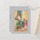Jolly smiling green-robed Victorian Father Christmas carrying his sack of gifts being welcomed by two adorable children into their home. Background colour is editable. Back features custom complementary graphics with editable text fields.