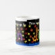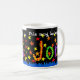 Une grande tasse blanche avec les mots "Cette tasse appartient à" en lettres blanches, suivie de "Jon" en collage de papier peint à la main, avec un arrosage d'étoiles rouges, orange et jaunes, sur un arrière - plan noir. Adaptée au lave-vaisselle et au four micro-ondes.