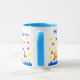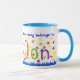 A large, good quality white ringer mug with a powder blue rim and handle with the words, 'This mug belongs to' in blue and a handpainted paper collage 'Jon' front and back, on a white background. Microwave and dishwasher safe.