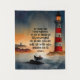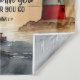 Inspirational quote scripture tapestry depicts a foggy night ocean watercolor including a boat and a red and white lighthouse with the light shining in the dark. It features Bible Verse Joshua 1:9, "Be strong and courageous, do not be afraid or discouraged, for the Lord your God will be with you wherever you go."
