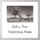 The image showcases a black and white photograph of a desert landscape featuring two prominent Joshua trees. The trees stand tall against a muted sky, their branches reaching out in a variety of directions. The foreground is filled with low-lying desert vegetation, creating a sense of depth and texture.
