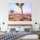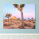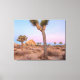 The image captures a serene desert landscape featuring Joshua Trees under a pastel sky. A prominent Joshua Tree stands in the foreground, its trunk textured and branching into two distinct arms. In the background, a rocky outcrop and several smaller Joshua Trees dot the arid terrain. The sky transitions from a soft blue to a gentle pink as the sun is rising.