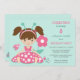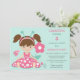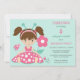 Cette invitation à la fête d'anniversaire de coccinelle est appropriée pour les filles jusqu'à l'âge de sept ou huit ans. L'avant est ornée d'une adorable petite fille habillée d'une robe de pois rose et blanc et portant des antennes turquoises et roses. Deux petites bestioles à pois de polka et une fleur rose sont à côté d'elle. Votre texte personnalisé est rose, vert turquoise foncé et gris sur le côté droit. Tout est placé sur un arrière - plan turquoise clair. Le dos de l'invitation est de la même couleur, avec une bordure inférieure de mignonnes petites filles bugs. Graphiques de Prettygrafik Design, © Prettygrafik.com
