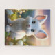 Puzzle. Un mignon lapin blanc aux grands yeux bleus et à la fourrure moelleuse se trouve au milieu de fleurs blanches et de feuillage vert, avec un coucher de soleil doux en arrière - plan. Le décor évoque un sentiment de chaleur et de sérénité.