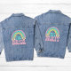 Veste en jean d'inspiration hippie drôle et mignonne pour la future mariée à sa fête de bachelorette. Le dos est décoré de "The Bride" dans une grande police de caractères rose et bleu turquoise, d'illustrations de fleurs pop-art des années 70 et d'un arc-en-ciel rose, bleu, vert et jaune. Une veste coordonnée "The Party" est disponible pour l'équipe de plage.