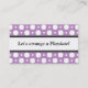 Personnalisés pour votre famille, ces Cartes de visite à deux côtés sont conçus avec un motif à points de polka assortis avec des tailles de cercles blancs alternant sur un violet de style café. Sur le devant, on peut lire "arrangeons un Playdate!", et sur le dos, les noms, coordonnées et adresses de vos autres enfants sont imprimés en noir sur blanc.
