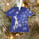Cet ornement de vacances présente une silhouette argentée joueur de basket-ball féminin devant un spray de flocons de neige argentés ornés. L'image est placée sur un arrière - plan bleu profond dégradé. Votre texte personnalisé est en argent sur la manche gauche, et un deuxième champ est en bas à droite. Le dos de l'ornement a le même arrière - plan bleu et des flocons de neige, et des champs de texte supplémentaires pour vous de customiser. Parfait pour le joueur de basket ou le fan.