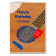 Une carte d'anniversaire pour un cousin qui aime la guitare. Gros plan d'une guitare avec un plectrum encastré dans les cordes. Sur la plectrum se trouvent les mots "You Rock". Une carte d'anniversaire pour un musicien qui aime la guitare.