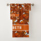 Cette serviette à thème de basket-ball cool présente un motif aléatoire de balles de basket de taille variée tournées de chaque côté sur un arrière - plan de couleur orangée-marron (pas sûr de quoi appeler cette couleur haha - de toute façon, c'est personnalisable !) - deux panneaux de chaque basket-ball sont recolorés - un orange et un blanc - personnalisent la serviette de bain & serviette avec son nom une bande de couleur orange rond pleine largeur - par katz_d_zynes