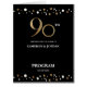 Personnalisez ce grand programme de fête de 90e anniversaire en or et en noir confetti. Célébrez et incluez l'itinéraire de la fête pour vos invités et aussi une photo et un message spécial des célébrants de l'anniversaire. Le message spécial est une excellente occasion de remercier les invités et de commencer la quatre-vingt-dixième fête à droite.