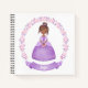 Une jolie princesse aux cheveux brun foncé dans une robe rose scintillante décore ce cahier. Le dos du cahier a un motif floral rose et violet délicat. Personnalisez-le avec votre nom. Fait un joli cadeau ou faveur de fête d'anniversaire. Conçu pour vous par Blackberry Boulevard.