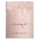Un faux rose or métallique à l'aspect arrière - plan avec l'or rose élégant et rose faux parties scintillant gouttes, la peinture goutte à goutte. Personnalisez et ajoutez un nom, une lettre monogramme et un titre. Le nom est écrit en Bourgogne avec un grand script de style moderne et écrit à la main avec des swashes. Parfait pour l'école, le travail ou comme journal secret. Pour que les swashes ne suppriment que le nom de l'échantillon, laissez les espaces ou émoticônes devant et après le nom.