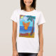 The California Beach Angel Painting shows an yellow-orange angel hovering over the ocean with the words "joy" on a cloud that has the sun peeking through. The words "peace" appear below on the sand next. A cheerful palm tree grows on the beach. Customize this orange beach angel art t-shirt to make personalized guardian angels gifts!
