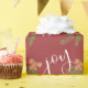 This Christmas wrapping paper features the word "joy" in a trendy white calligraphy style text on the dark red background. The design is accented with watercolor painted Christmas greens with a bow.