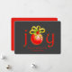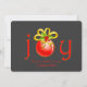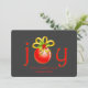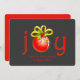 Stylish flat style Christmas greeting card done in a dark grey background, with red graphic text reading joy, with the o being a red decorated Christmas ball ornament. Personalize the red text, on the bottom of the card to suit your company needs.
