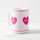 Beautiful mug with heart, pink polka dots and personalized joy, love, light text.