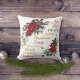 This pretty holiday pillow features a festive red and green watercolor poinsettia bouquet image at the top left, and another image at the bottom right. At the centre of the pillow are words which are associated with Christmas, including joy, love, peace, laughter, gifts, music, family, friends, happiness, and children. The text is in matching red, green, and gold. The image and text are placed on a pure white background. Both sides of the pillow have the same image.