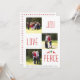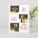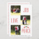 Joy, Love, Peace and red, white pattern Christmas simple photo collage of three photos card. It features the words "joy, Love, Peace" in red and green and three family photos. A geometric pattern in red and white covers the back. Photography © Storytree Studios, Stanford, CA
