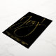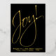 This holiday card is simple, minimalist, and elegant. It features a sparse design with the word "Joy!" written in fancy script pressed gold foil lettering, along with a short message on a classic black background. The back has space for your full frame photo or picture. Wonderful way to send Christmas or non-specific holiday greetings.