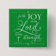 Pinback button featuring trendy typography from the the verse in Nehemiah 8:10, "... for the joy of the Lord is your strength." Background (green) can be customized to the colour of your choice. Designed by Simply Scripture by Robin.
