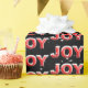 Christmas red JOY text on black background with snow caps and snowflakes.