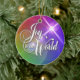 Multi-coloured background with Joy to the world in fancy cursive script., blazing white star to the right. blues greens purple and red background. back has "the Lord hath Come" in the same cursive script.