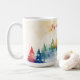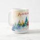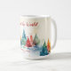 "Joy to the World" Christmas mug has editable text in the red script. The winter holiday season design includes a colourful pine tree hillside with falling snow. It is a vintage-inspired watercolor piece. All the text can be changed. Be sure to change the name(s) and date to those you prefer.