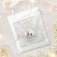 Favour bags with a magical holiday design. Featuring a silver Christmas ball with snowflake decorations and finished off with a pretty silver bow. The background is a silver bokeh lights illustration with elegant stars scattered throughout. Text says: Joy to the world.