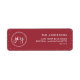 Étiquette d'adresse de retour de vacances dans une ombre profonde de rouge, parsemée de minuscules confettis, et de joie écrite en écriture brosse à l'intérieur d'une simple couronne blanche.