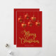 Joyeux Noël dans une police de caractères décorative fantaisie en couleur dorée avec des tons rouge et or accrochés à la conception des billes de Noël. Cette carte de Noël rouge arrière - plan est conçue pour que vous puissiez changer la couleur de l'arrière - plan et aussi entrer votre nom de famille ou le supprimer si vous souhaitez seulement avoir le design sans le texte.