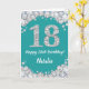 Joyeuse carte de 18e anniversaire Turquoise Turquoise Aqua et Silver Parties scintillant avec nom personnalisé. Pour plus de personnalisation, cliquez sur le bouton "Customiser" et utilisez notre outil de conception pour modifier ce modèle.