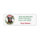 Sur cette étiquette d'adresse de retour de vacances, un majestueux chien Rottweiler est encadré dans une couronne verte de Noël avec un arc rouge en haut. Votre texte personnalisé est en vert à droite, avec un champ de texte pour un message de bienvenue en rouge ci-dessous.