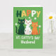 Cette carte montre trois chats stylisés alignés sur un fond vert émeraude profond, leurs corps disposés en une rangée horizontale régulière qui procure une sensation de proximité et de convivialité 💚. À gauche est assis un chat vert forêt aux yeux jaunes perçants, penché légèrement vers le centre comme s'il tenait compagnie aux autres. Au milieu, un chat blanc est parsemé de petites formes de trèfles à quatre feuilles, et son visage calme semble croiser le regard du chat de gauche d'une manière silencieusement affectueuse ☘️. À droite, un chat orange-roux complète le trio avec un doux sourire qui correspond à l'ambiance amicale du groupe. Des trèfles à quatre feuilles blancs flottent autour d'eux comme des confettis légers, remplissant l'espace sans encombrer les chats. Près du haut, « HAPPY » apparaît en lettres arrondies, alternant le vert clair, l'orange et le blanc sur le mot. Le long du bas, « ST