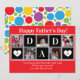 Papa va adorer cette carte personnalisée de la fête des pères. Il y a des modèles pour 5 de vos photos préférées des enfants dans un motif en bloc avec P A P A écrit entre les deux et un cœur de chaque côté avec l'année. En bas, il y a un message personnel à Papa. Utilisez-le tel quel ou ajoutez votre propre message. Personnalisez avec les noms des enfants en dessous. Le fond est rouge et le verso est un motif de points de différentes tailles rouges, bleus, jaunes et verts.