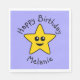 Une étoile jaune souriante sur un arrière - plan mauve souhaite un joyeux anniversaire.