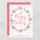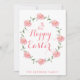 Cartes de Pâques Happy personnalisées avec lapin rose, couronne et texte personnalisable où vous pouvez ajouter votre nom de famille avec le côté rose du dos de la carte