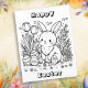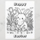 Page de coloriage pour enfants sur le thème de Pâques. Mignonne lapin de Pâques avec ses oeufs de Pâques entourés de tulipes.