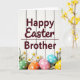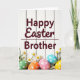 Cette carte présente un message bordeaux riche indiquant « Joyeuses Pâques Frère » centré sur un fond blanc qui ressemble à des planches de bois verticales avec de légères rainures. Les lettres sont hautes et claires, laissant beaucoup d'espace ouvert autour d'elles pour que le message se sente direct et affectueux. Près du bas, une large bande horizontale de détails printaniers ajoute de la couleur, comme une petite scène organisée juste pour lui 🌷. Plusieurs formes d'œufs ovales brillants avec des pois blancs nets sont regroupées, suggérant un ensemble de cadeaux amical et réfléchi. Les œufs sont verts, orange, roses, bleus et jaunes, et ils se nichent dans des feuilles vertes douces comme s'ils étaient placés avec soin 🐰. Des marguerites blanches avec des centres jaunes ensoleillés et de minuscules fleurs blanches remplissent l'espace entre les œufs, donnant à la mise en page une sensation douce et serrée. La bande inférieure ressemble à une
