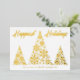 Un script d'or chic compagnie carte de feuille d'or de vacances avec 3 beaux arbres en flocons d'or en dessous Happiest Holidays écrit en écriture cursive. Ajoutez votre nom d'entreprise ci-dessous. Personnalisez ces cartes de papier doré d'entreprise pour le marketing client en hiver.