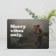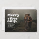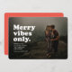 Envoyez une fête rétro amusante avec ce carte photo unique qui propose une pièce sur les "bonnes vibes" avec un plus festif "joyeuses vibes seulement". Le texte blanc se trouve sur une seule photo horizontale avec beaucoup de place pour le texte et les noms personnalisés. Le dos est un rouge rétro amusant et saisissant avec une texture en mauvais état. Autres couleurs et styles disponibles ainsi qu'un téléchargement numérique de la carte de Noël.