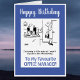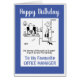 Carte d'anniversaire Office Manager. L'assistante personnelle part tôt parce qu'elle n'est pas arrivée très tard. Personnalisez avec vos propres détails et message. Carte d'anniversaire idéale pour un directeur de bureau. Arrière - plan bleu foncé.
