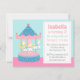 Invitez vos invités à l'anniversaire de votre fille avec ce rose mignon et joyeux bleus vont invitation de fête d'anniversaire de maison. Le carrousel minuscule coloré a les chevaux blancs, les étoiles et le ciel. Doux et adorable pour un cirque ou une partie de thème de carnaval. Vos invités d'enfants seront excités pour recevoir l'invitation ! Personnalisez facilement avec vos détails de partie.