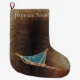 A dog sled with a teal sled bag superimposed on a digital rendering of caribou (reindeer) fur. Text reading "Season's Greetings" also appears. French text reading, "Joyeux Noёl" appears in glowing blue and white. You may personalize the stocking by adding a bit of text on the sled bag.