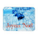A blue and white image of a cow moose in an urban setting during winter. French text reading, "Joyeux Noёl" appears in red. Moose are year-round residents in many Alaskan communities. Here in Anchorage there are about 1500 animals, along with wolves, brown bears and other wildlife.They are usually well-behaved. They often cross streets at the crosswalks after waiting for a walk signal.